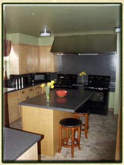 A large kitchen, dining, and living area are available for rent. The kitchen is fully equipped